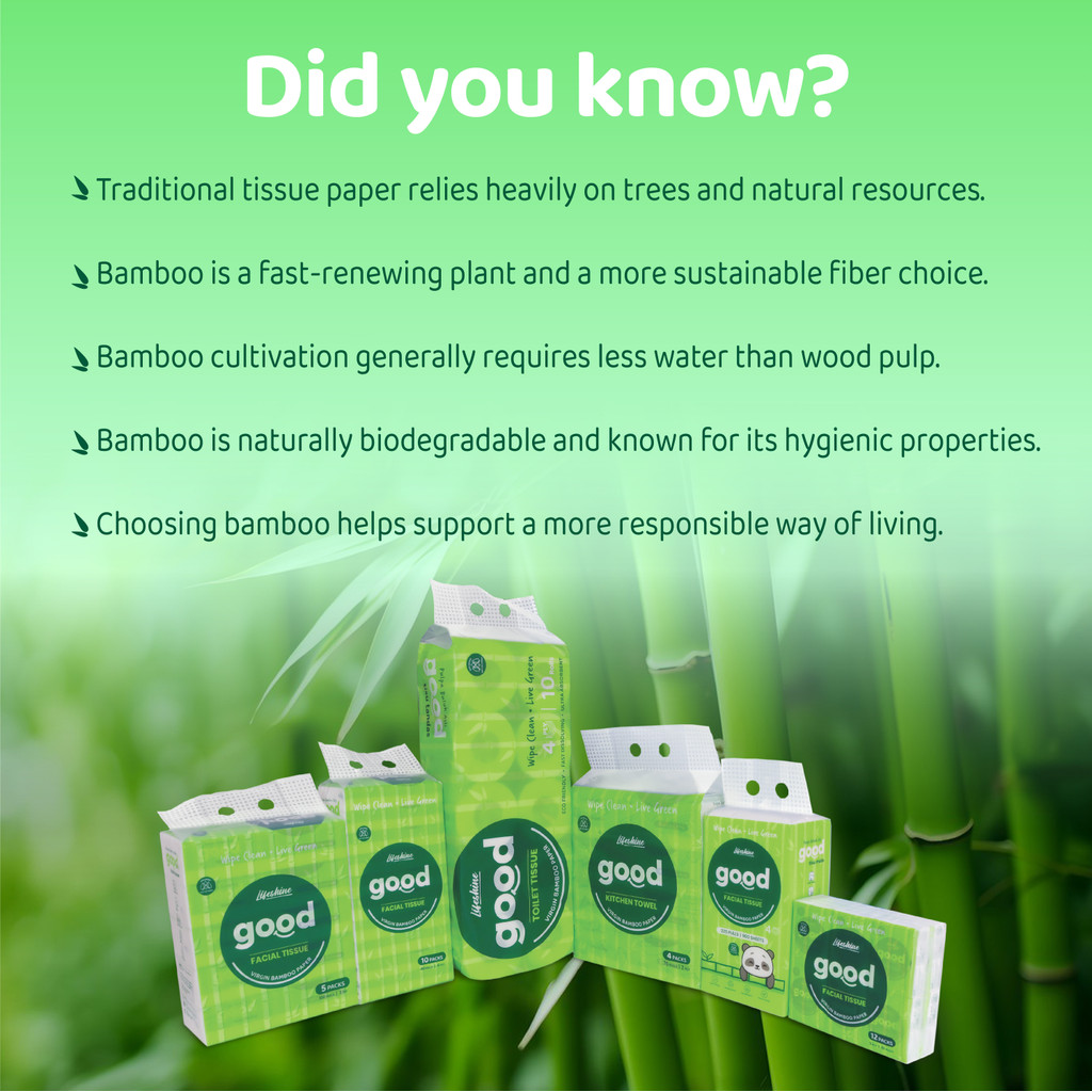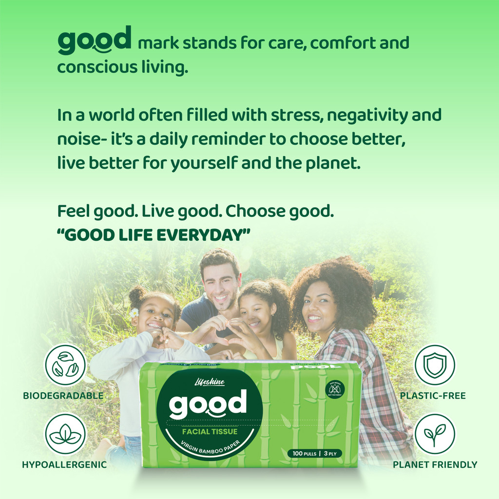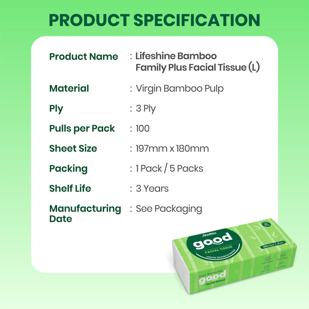 Experience everyday comfort with Lifeshine Good Family Plus Facial Tissue L, thoughtfully crafted for the whole family. Made from premium bamboo pulp, these 3-ply tissues deliver exceptional softness and strength in every sheet—gentle on sensitive skin, yet durable enough for daily use.