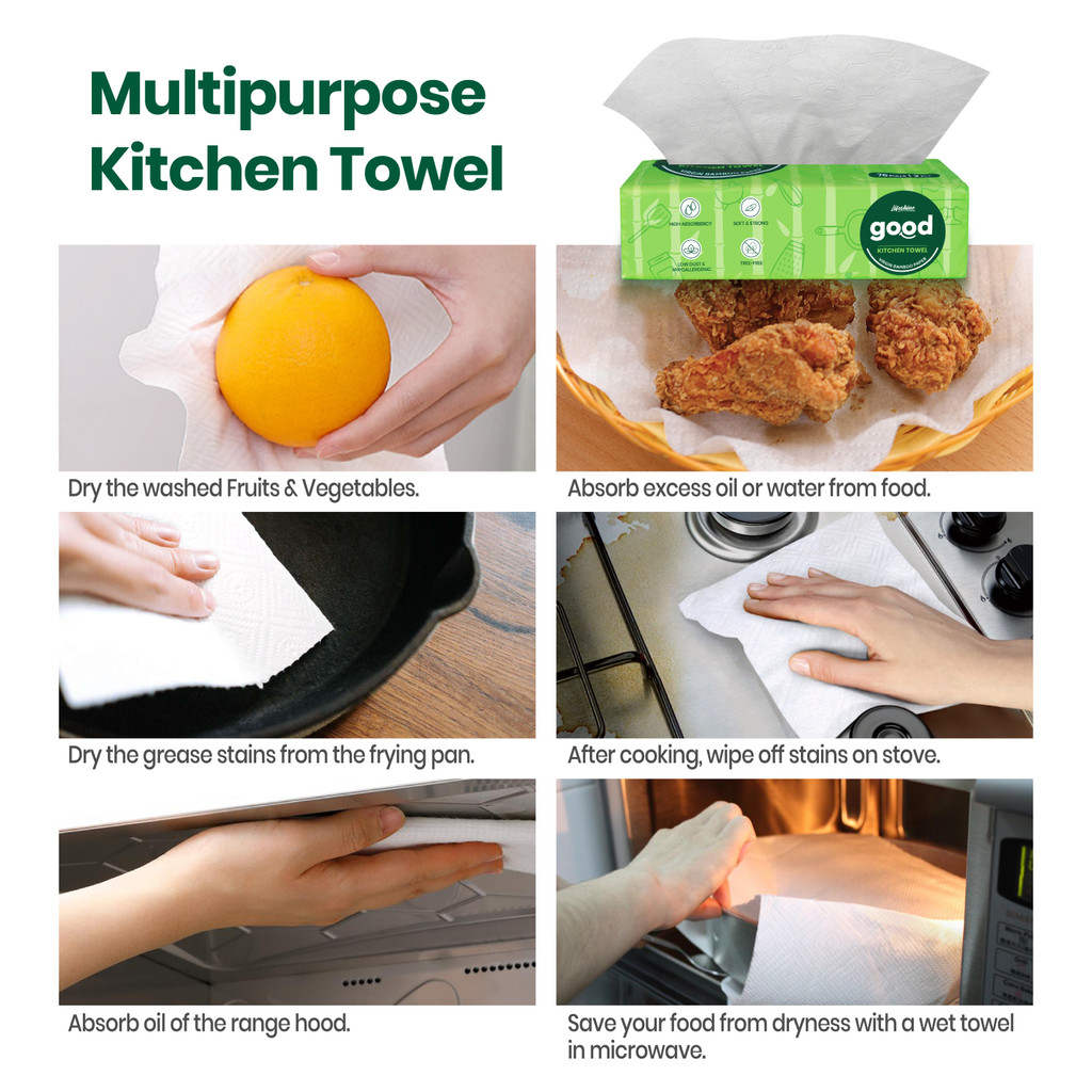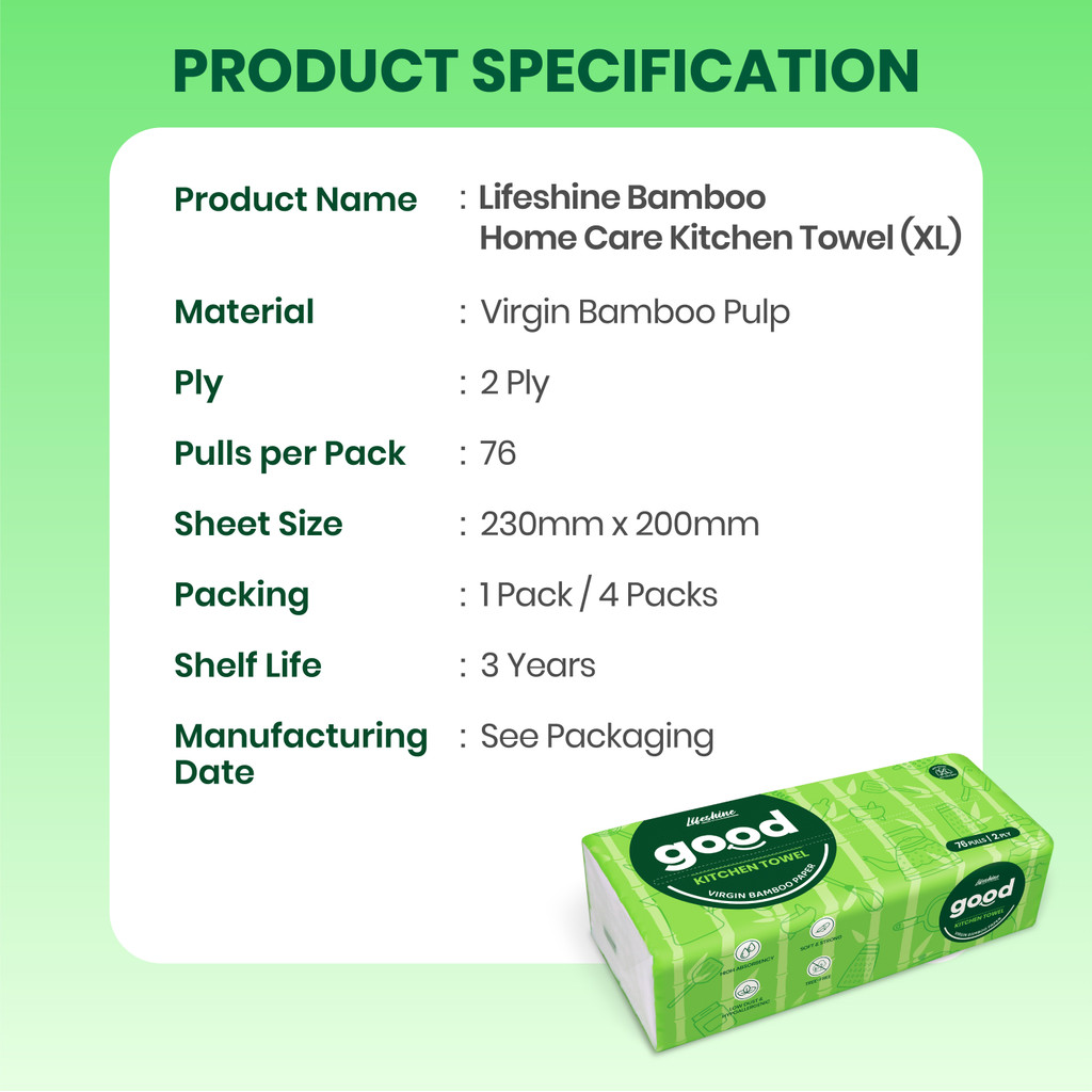 Keep your kitchen clean and eco-friendly with Lifeshine Good Home Care Kitchen Towel XL. Made from sustainably sourced bamboo fibers, these 2-ply kitchen towels are extra absorbent and gentle yet strong — perfect for everyday spills, messes, and cleanup tasks around the home. The XL size sheets cover more surface area with fewer towels, making your chores faster and more efficient.